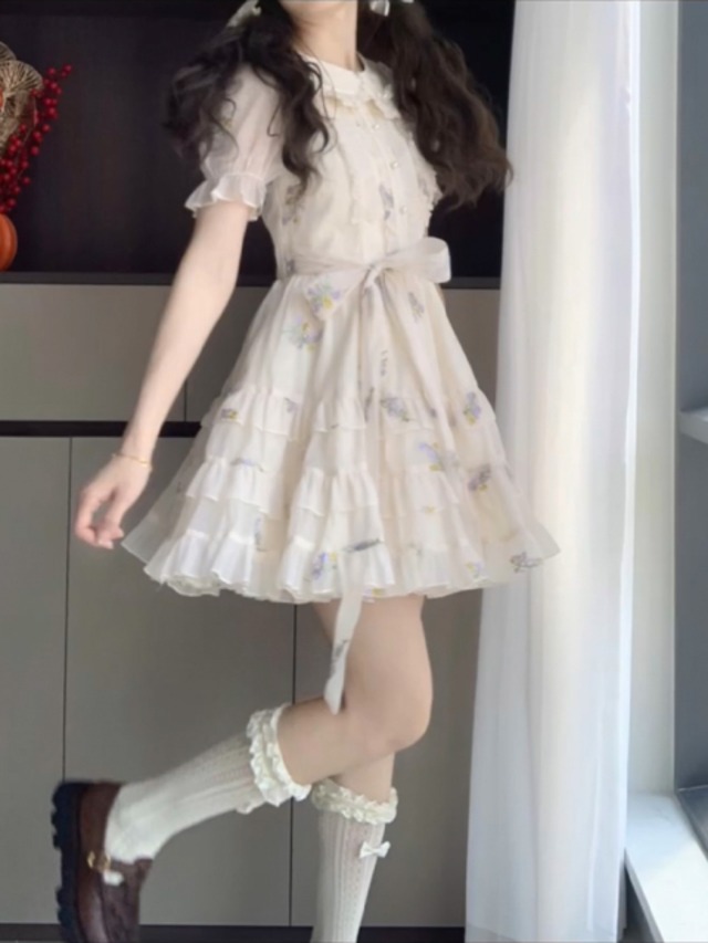 日本のかわいい人形の襟の花柄のドレス女性の夏の気質の甘い小柄なウエスト痩身女の子のスカートの妖精