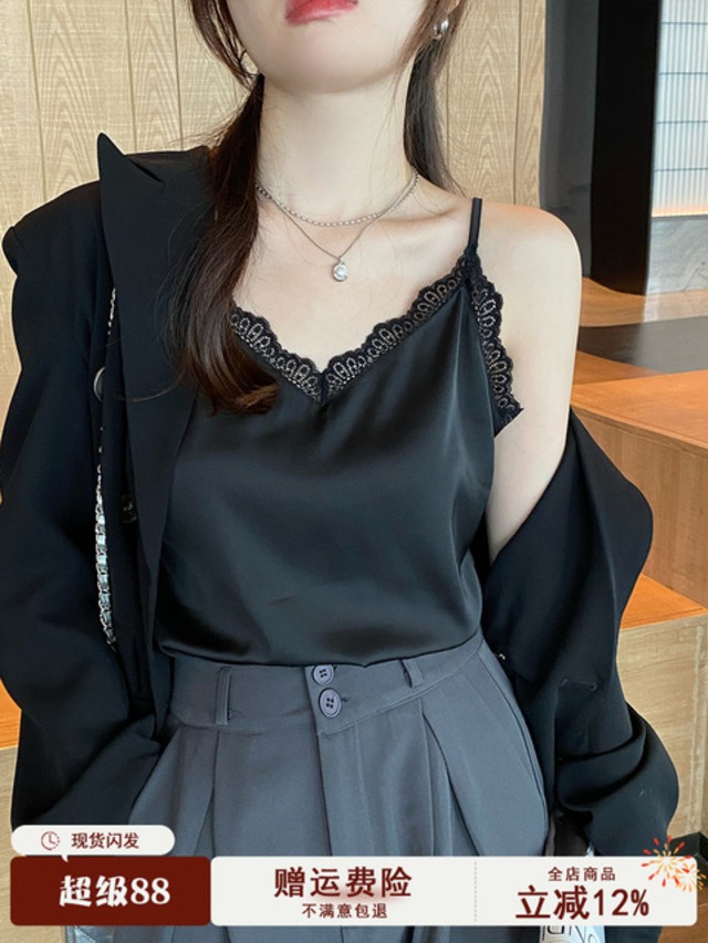 セクシーな黒のレースのサスペンダー、女性のスーツボトム用のベスト、2025年のアイスシルクのVネック、美しいバックトップ