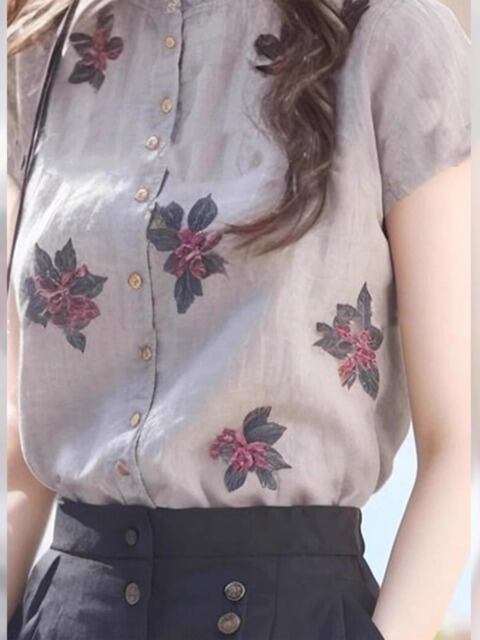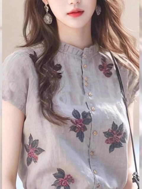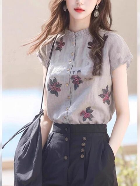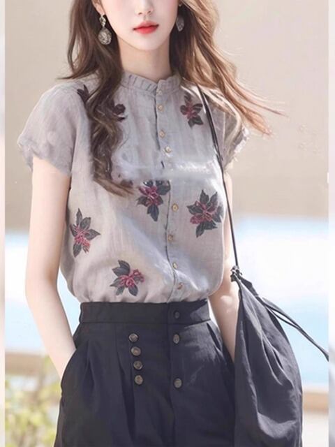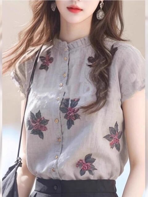 婦人服2025年夏の新作多用途スタイリッシュシックな小さなシャツプリント半袖シャツ女性