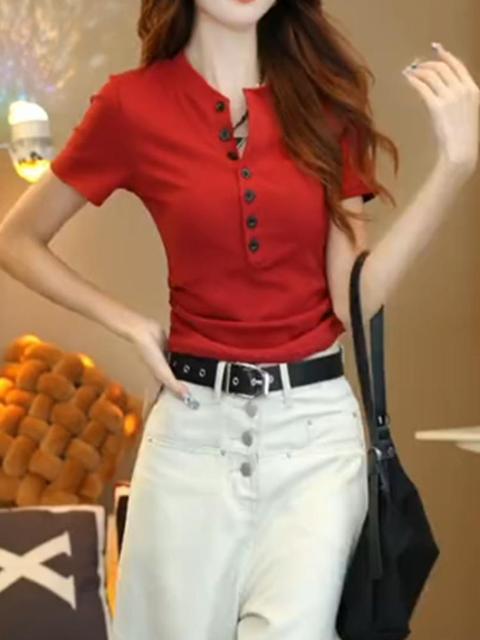 このTシャツは、シンプルな赤色とスリムなシルエットが特徴で、カジュアルな日常からお出かけまで幅広く活躍します。ショート丈のデザインが、あなたのスタイルを引き立て、軽やかな夏のファッションを楽しむことができます。