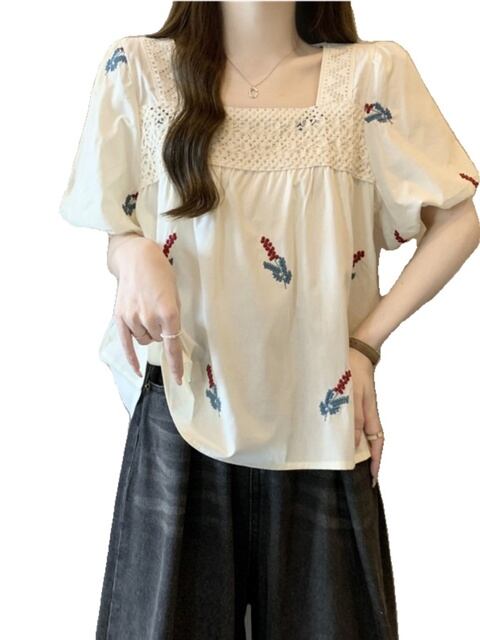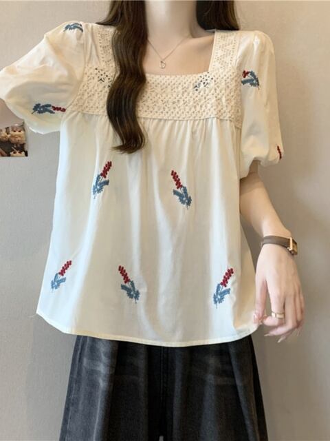 フレンチレーススクエアネックパフスリーブシフォン半袖シャツレディース夏プラスサイズファットmmフラワー刺繍ベビードールトップ