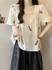 フレンチレースの美しいディテールと、スクエアネック、パフスリーブのコンビネーションが、フェミニンな魅力を引き立て、自信を持って着用できる一枚です。この半袖シャツは、カジュアルな日常使いから特別なお出かけまで、さまざまなシーンで大活躍します。