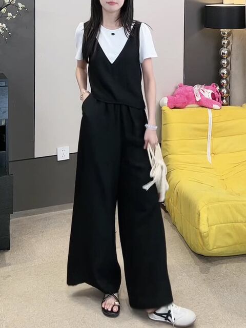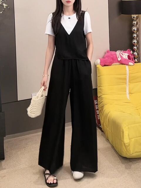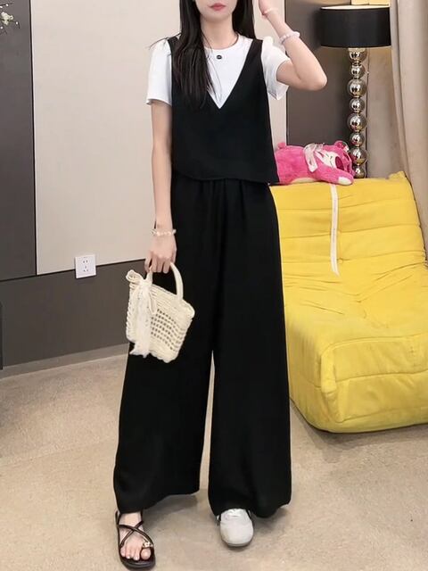韓国ファッションカジュアルスーツレディース2025夏フェイクツーピースコントラストカラー半袖Tシャツストレートワイドレッグパンツツーピーススーツ