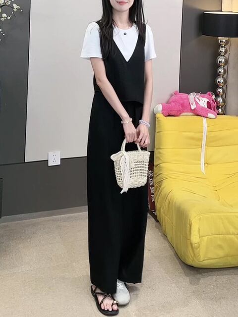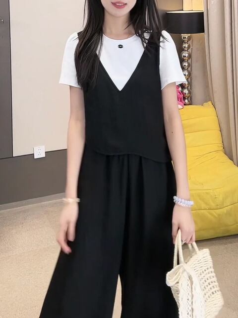 2025年夏の新作として登場したこのフェイクツーピーススーツは、コントラストカラーのデザインが特徴で、一目で華やかな印象を与えます。半袖Tシャツは軽やかさを演出し、ストレートワイドレッグパンツは動きやすく、快適な着心地を提供します。