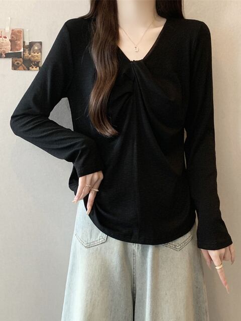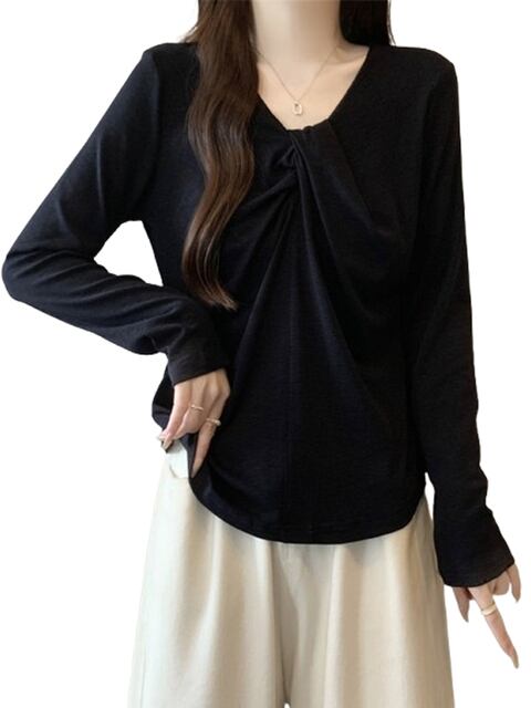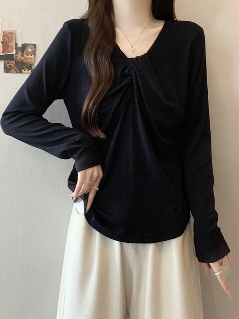 ストレートショルダーツイストVネック長袖Tシャツボトムシャツ初秋2025新作レディース服トップス