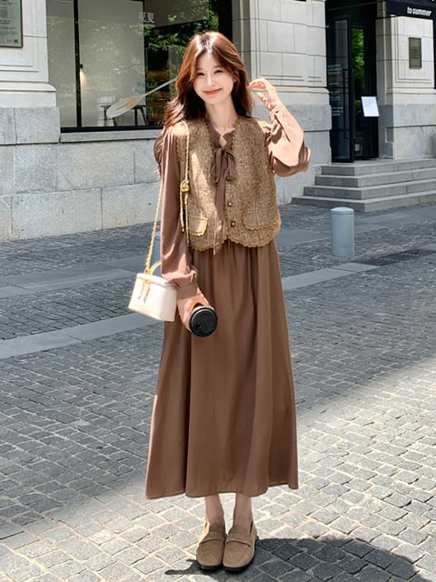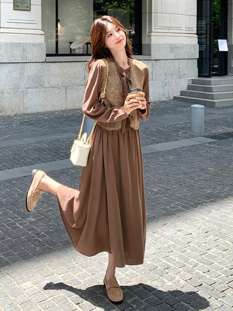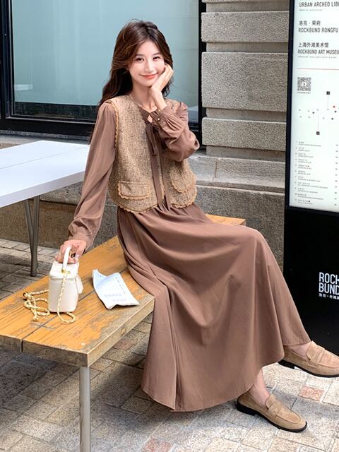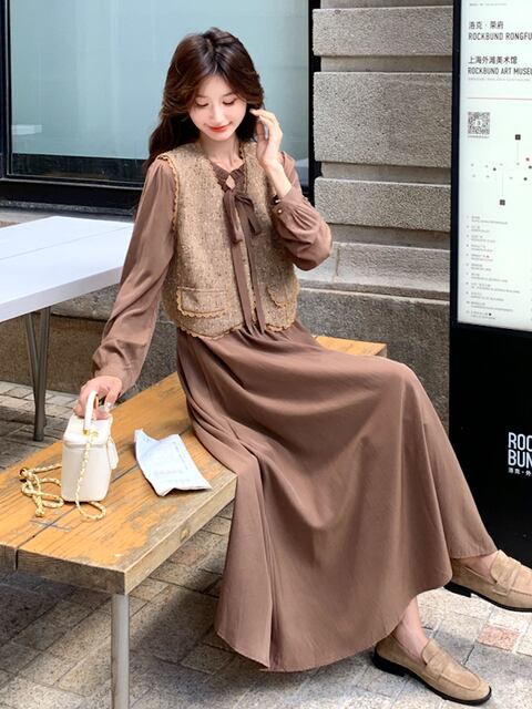 ドレス、ベストスーツ女性2025年秋気質レースウエストロングスカート