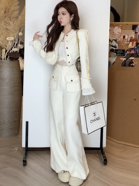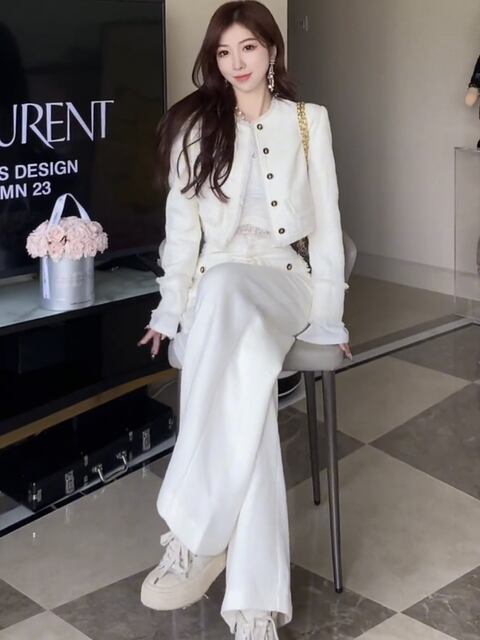 心地よさとスタイルを兼ね備えた、**ヨーロッパの品物のおしゃれなスーツの女性の秋の有名人の気質の小さい香りのスタイルのジャケットハイウエストのスリムなワイドレッグパンツのツーピースのスーツは、2025年秋のトレンドアイテムとして見逃せない一品です!**