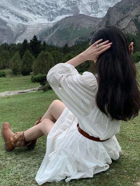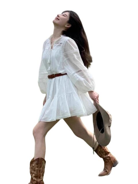 白い長袖ワンピースの女性の秋2025新しいスタイルの小さな北西新疆旅行休日の短いスカート