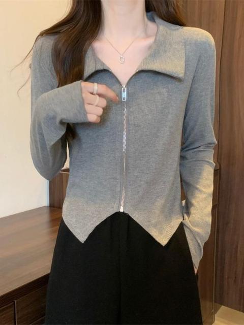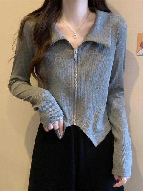 2025年初秋の新作レディースファッションポロカラーイレギュラーロングスリーブTシャツ、スリミングジッパースウェットシャツ/フリースセーター