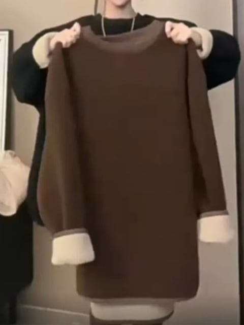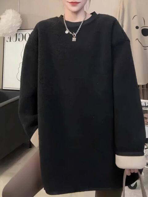 秋冬 レディース トップス、ミドル丈、裏起毛、厚手、ゆったりスタイル、ラムウールスウェットシャツ、フリースセーター、冬レディース