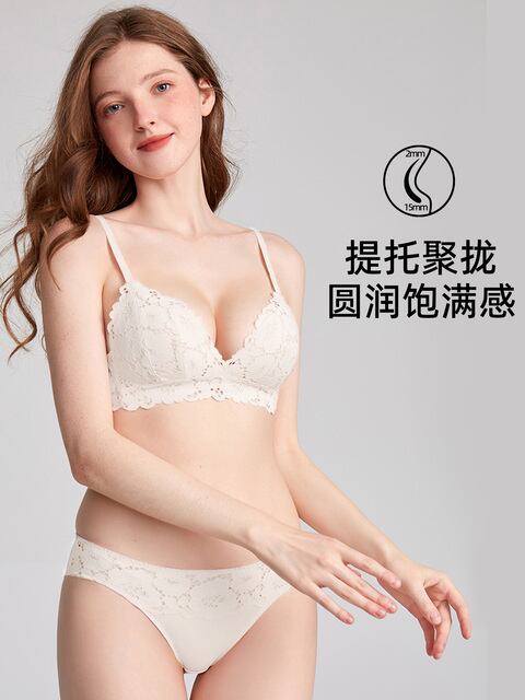 このブラセットは、薄型ノンワイヤーのデザインにフレンチスタイルのレースが施されており、優雅さと快適さを両立しています。プッシュアップ効果により、自然な魅力を引き出し、特に小さなバストを美しく見せる仕上がりとなっています。