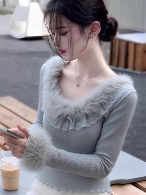 このセーターは、高品質なニット素材を使用しており、柔らかな肌触りと適度な伸縮性を提供します。グレーのファートリムがアクセントとなり、華やかさを添えながらも、シンプルなUネックデザインが女性らしいシルエットを引き立てます。これ一枚で着ても、インナーに重ね着しても素敵なスタイルを演出します。
