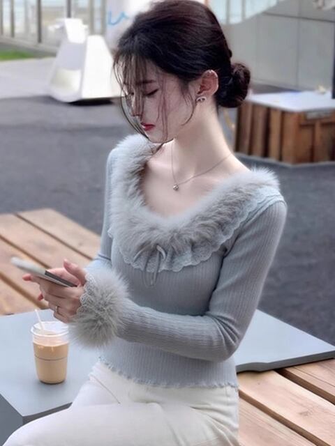スタイリッシュなグレーのファートリムが施されたUネックの長袖ニットセーターは、冬にぴったりです。一枚で着ても、インナーに重ね着しても素敵です。